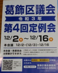 12月2日から第4回定例会(区議会)がはじまりました。1日の本会議は10時からスタート。今回は7人の議員が一般質問にたつので、2日間になりました。